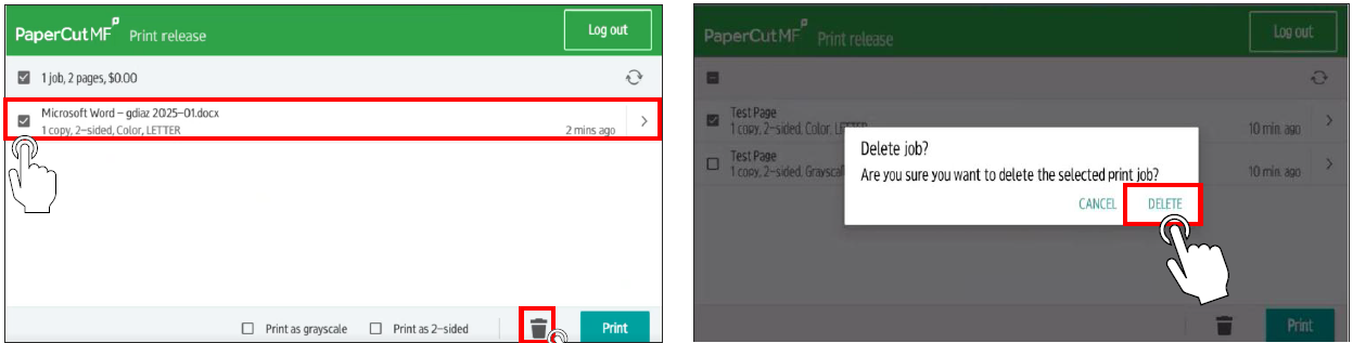 1. To delete a print job, select the print job(s) and press the trash icon. Press Delete to confirm.